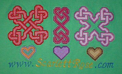 Here's six different Celtic Heart designs embroidered on a green t-shirt. The three small hearts are from the Small Hearts Collection 1