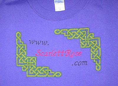 This is Celtic Corner 1, embroidered along with Scarlett's website address, on the front of a purple t-shirt.