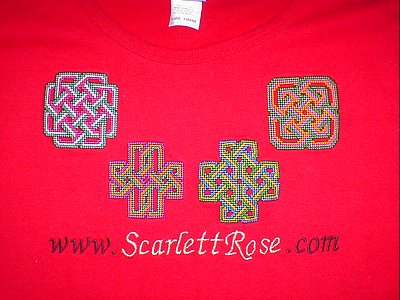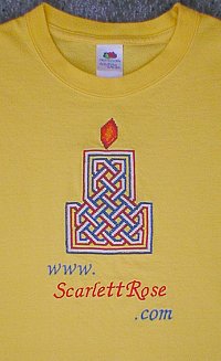 Here's Celtic Candle 1 Tricolor done in Red, White and Blue, along with the website logo embroidered on a yellow t-shirt.