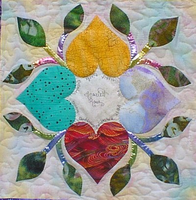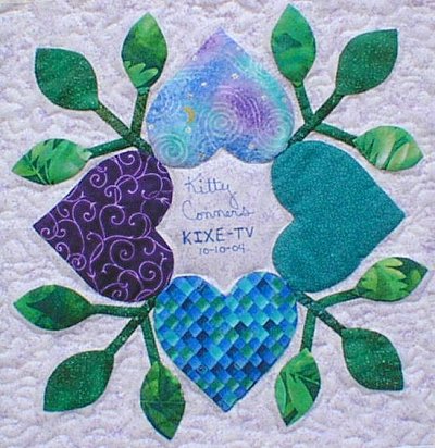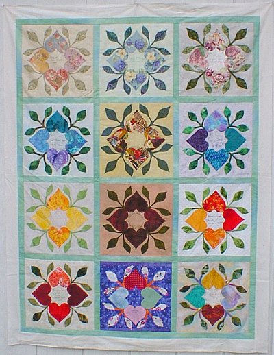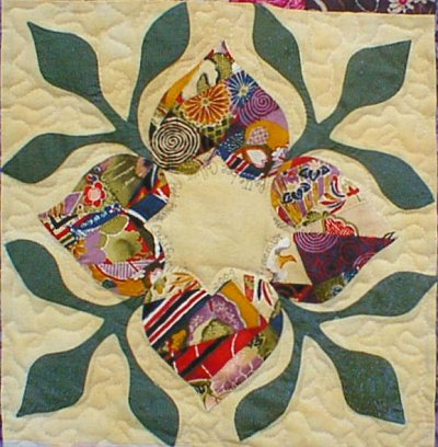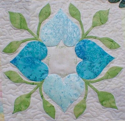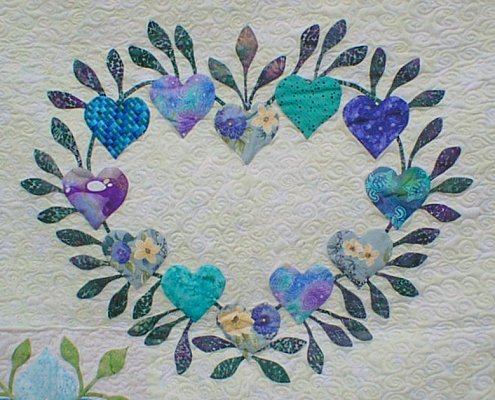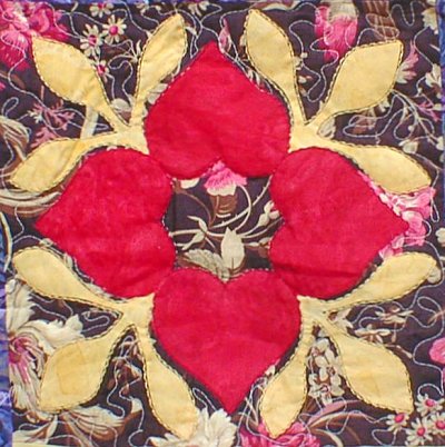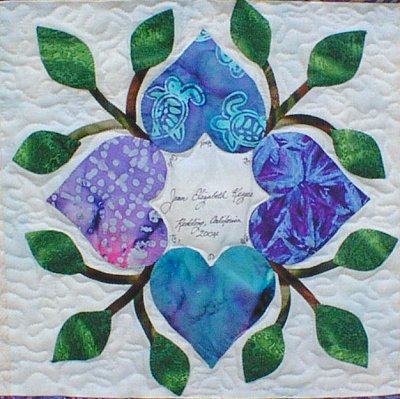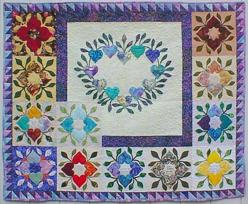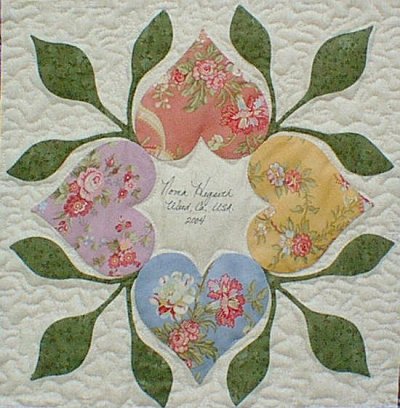 Betty McFadyen of Cottonwood, California is the first quilter to finish her quilt. The Heart Wreath in the center was designed by Scarlett Rose, using the hearts and leaves from the friendship block. The pattern for this Heart Wreath was given to all the quilters, American and Japanese, who participated in the Heart Circle.