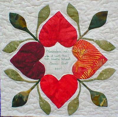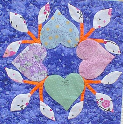 The block pattern used, with permission, for the friendship block exchange is the Heart Medallion block from "The Signature Quilt: Traditions, Techniques and The Signature Block Collection" by Pepper Cory & Susan McKelvey. Unfortunately, this book is out of print, but may still be available through Amazon, used book dealers or eBay.