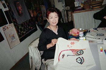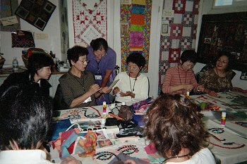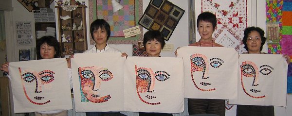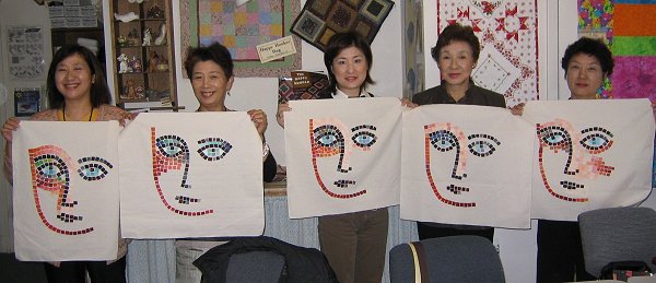 Jean is sharing a picture with the Japanese quilters as they work on their mosiac tile projects.