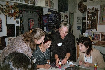 Here's Jean Keyes (interpreter) with Deanna Charlton (teacher) demonstrating to Michiko Shima and Toshiko Sakamoto how to make their fabric tiles.