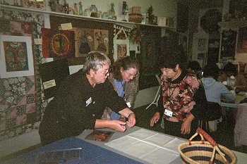 Deanna, with Jean assisting, helping Misako Misaki with her background fabric.