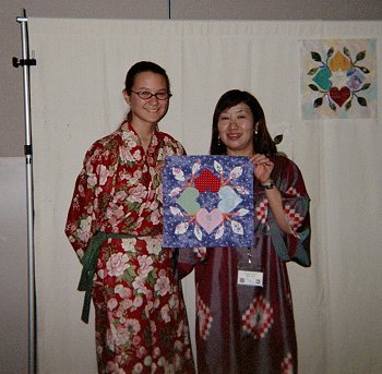 Heather Rose, wearing a yukata that she made herself, gives her Heart Circle block to Kazuyo Akitsu. Each quilter, American and Japanese, drew a name out of a Halloween pumpkin so that lucky person received their block.